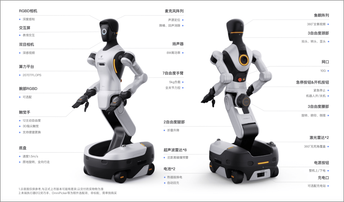 3)正在算力平台方面,精灵G1搭载了英伟达Jetson AGX Orin模组,而G2则升级至新一代Jetson Thor T5000模组,其算力高达2070 TFLOPS(FP4)。这一显著提拔使G2可以或许支撑大都机械模子正在端侧或边缘侧离线不变运转。